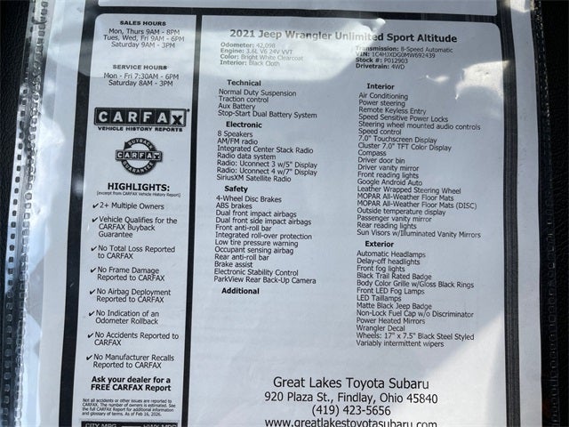 Completely serviced and safety inspected, buy with confidence, Bluetooth®, LOW MILES, 4WD, Carfax CERTIFIED Accident Free. 2021 Jeep Wrangler Unlimited Sport Altitude Bright White Clearcoat 4WD 8-Speed Automatic 3.6L V6 24V VVT